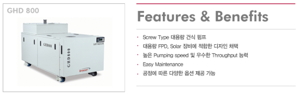 2002년 독일 라이볼트사의 미국 생산라인을 국내로 이전하면서 건식 진공펌프에 대한 원천기술을 바탕으로 개발된 당사의 제품에는 DD 시리즈에 이어, 현재 LD / HD 시리즈 및 GD/GHD 시리즈를 제조 판매하고 있습니다. 특히 당사가 만드는 건식 진공펌프의 핵심 기술은 스크류 타입(Screw Type)ㅢ 회전자를 제작하는 정밀성과 회전 내구성에 있는데, 높은 압력으로 공정장비 내부의 기체를 유출시켜야 하는 기기의 특성상 고속 회전을 견딜 수 있는 내구성과 스크류 사이에 윤활유가 사용되지 않을 정도의 정밀성이 요구됩니다. 또한 당사의 건식 진공펌프는 경쟁제품인 습식에 비해 여러 가지 장점을 가지고 있습니다.