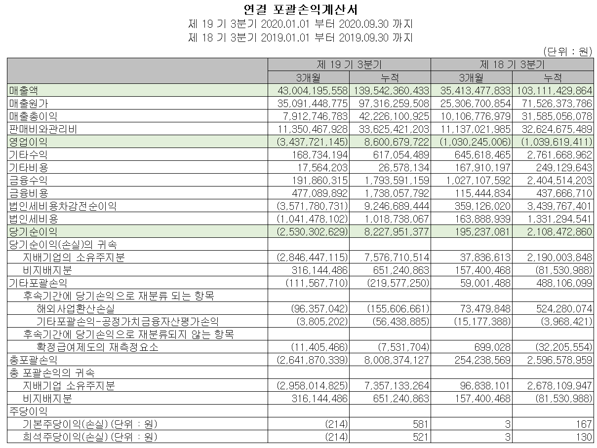 2020년 3분기 누적 기준 매출액은 1395억 원, 영업이익은 86억 원을 기록하면서 전년 동기 대비 각각 35%, 흑자 전환했습니다. 3분기 및 지난해부터 외형 성장에 따른 판관비 증가로 적자였다가 2020년 들어 반도체 및 디스플레이 공정용 진공펌프의 수주가 증가함에 따라 흑자전환에 성공했습니다. 지난 3분기 적자는 고객사 발주가 예상대비 줄었고, 일회성 고정비용이 반영된 결과입니다.