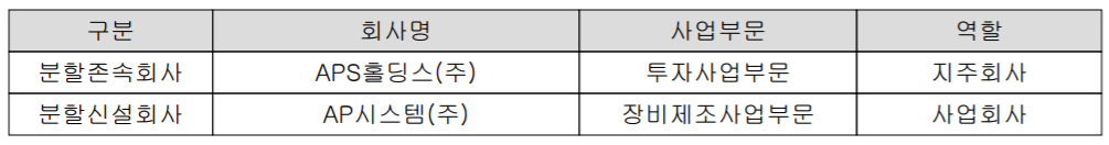 당사는 또한 2017년 3월 현 지주회사인 APS홀딩스와 인적분할을 통해 경영효율성 및 투명성을 극대화하기 위한 지배구조를 확립했습니다.