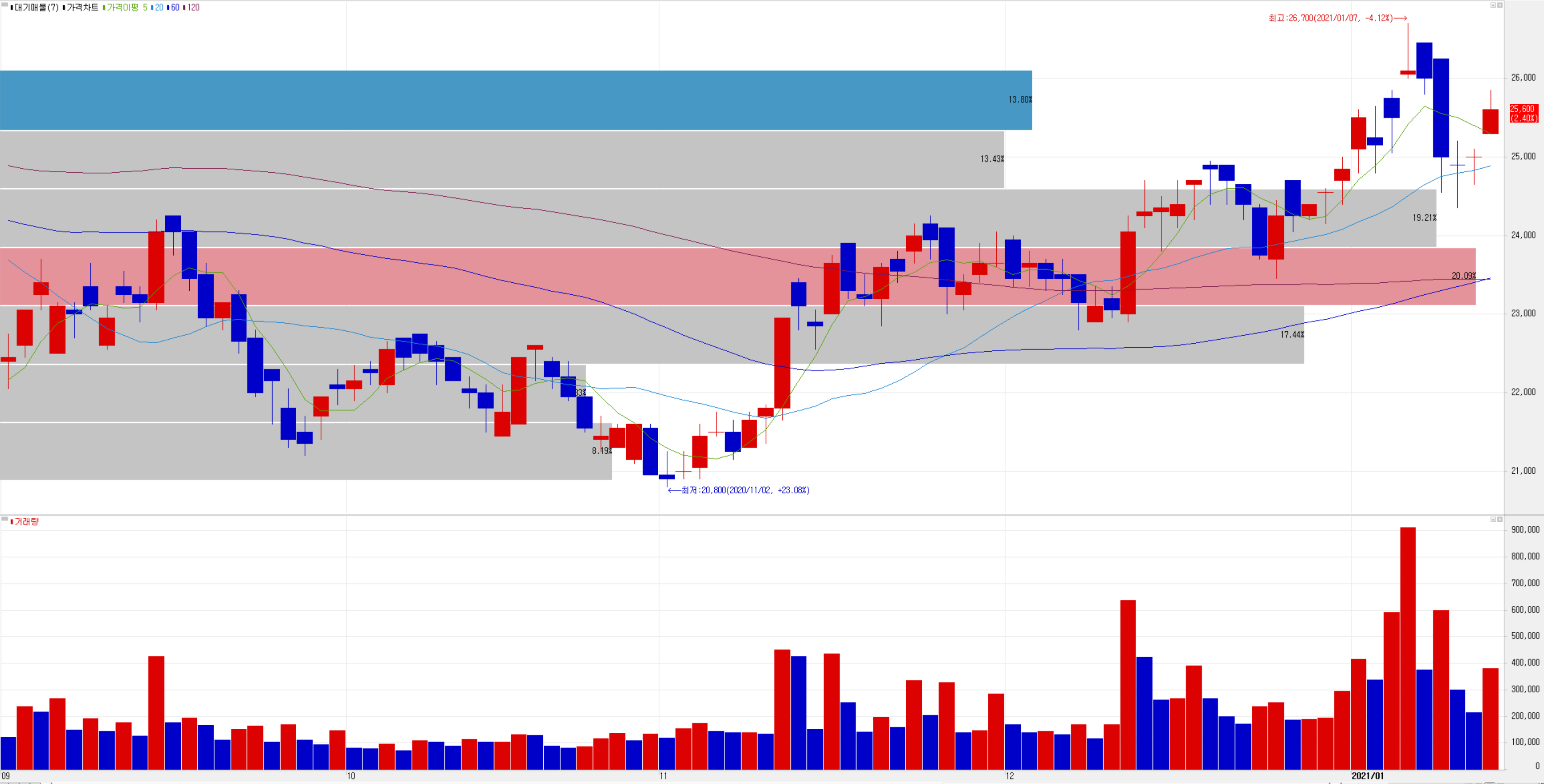 최근 3개월간 일봉 차트를 보면 연말 이평선 위로 주가를 지지하면서 상승하다가 최근 조정을 보이고 있습니다. 수급에서는 최근 며칠 동안 개인의 유입이 보이고 있지만 전반적으로 기관계와 외국인이 매수 우위를 보이는 종목입니다.