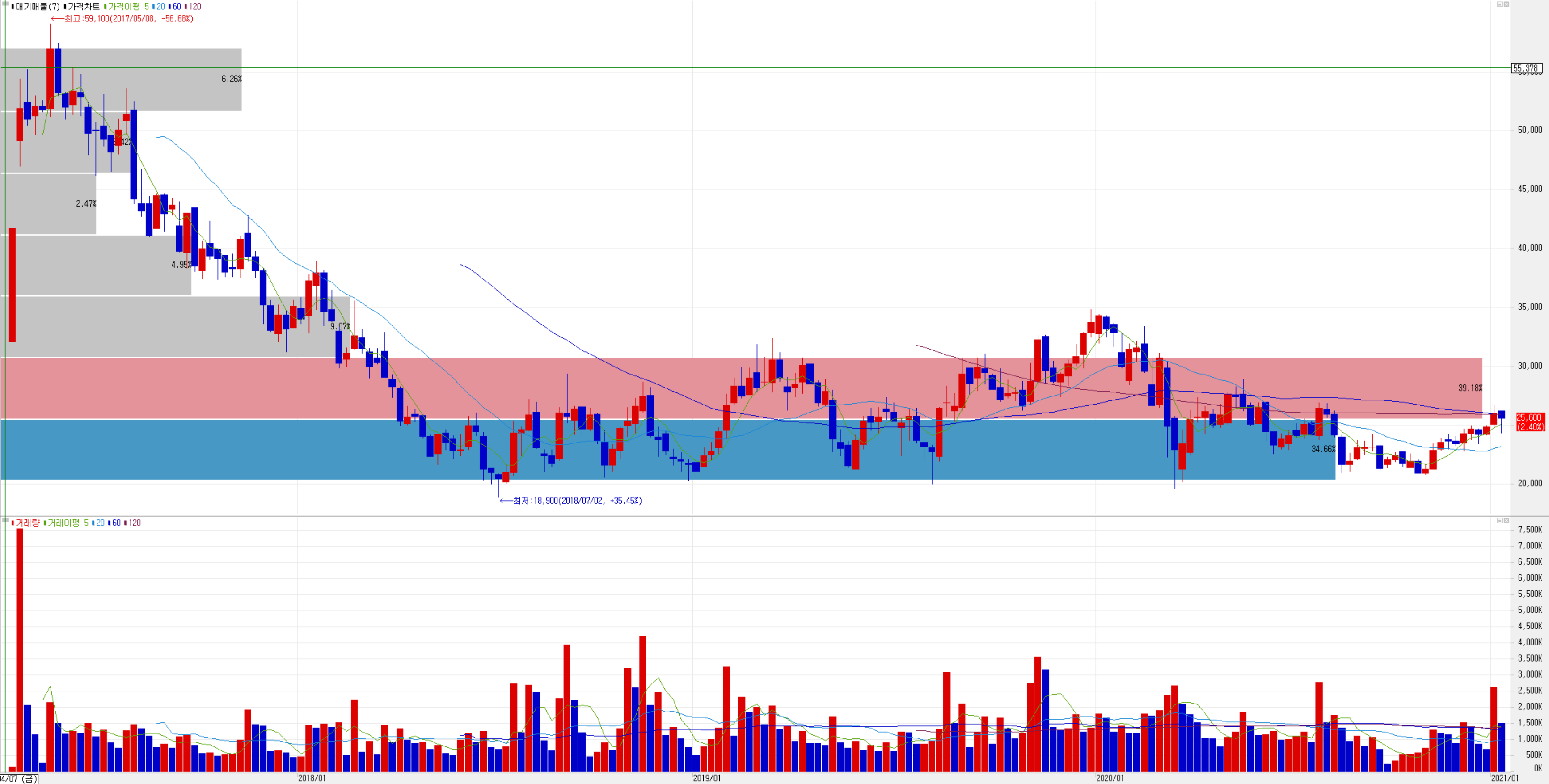당사의 주가는 2017년 3월 기업 분할 후 재상장하면서 최고가인 59,100원을 기록 후 하락세를 보이다가 2019년 말 상승 추세 앞에서 코로나19로 인한 주가 하락을 다시 맞았습니다. 하지만 코로나19 팬데믹 시즌에도 비교적 하락폭이 크지 않은 점을 볼 수 있습니다. 큰 흐름에서 재 상장 후 3년 간 바닥을 다지는 모습입니다. 큰 하락도 큰 상승도 기대하기 어려운 현재의 모습입니다.
