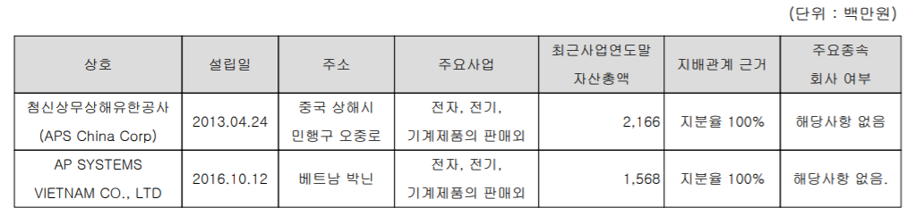 종속회사는 전자, 전기 기계제품의 판매 등을 목적으로 설립된 중국과 베트남 지사를 두고 있습니다.