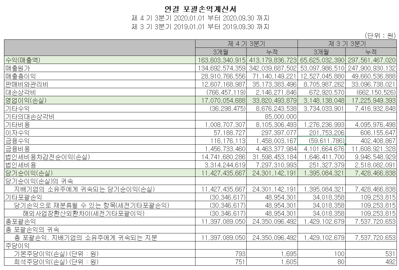AP시스템의 2020년 3분기 실적은 누적 매출액 4,131.7억 원, 영업이익 338.2억 원으로 전년 동기 대비 각각 38.8%, 96.3% 증가했습니다. 중국 디스플레이 고객사인 CSOT 등으로부터 발생한 매출과 삼성디스플레이 OLED 라인 가동률 증가로 인한 부품 비중이 증가하면서 양호한 실적을 기록했습니다.