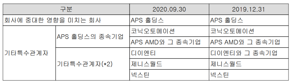 지주사인 APS홀딩스의 기타 특수관계자 중 웨이퍼 미소 결함 테스트 장비 전문 기업인 넥스틴이 포함되어 있습니다.