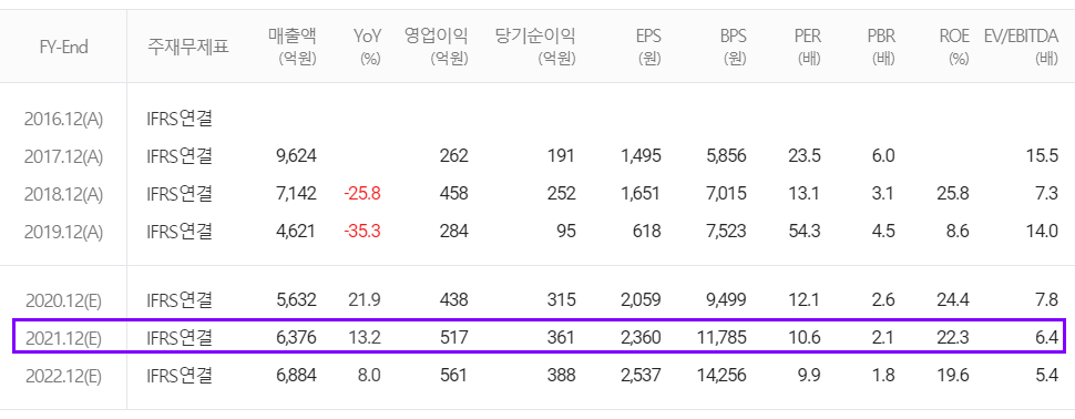 2021년에는 매출액 6376억 원으로 13.2% 증가, 영업이익은 517억 원으로 18% 증가하는 것으로 봅니다.