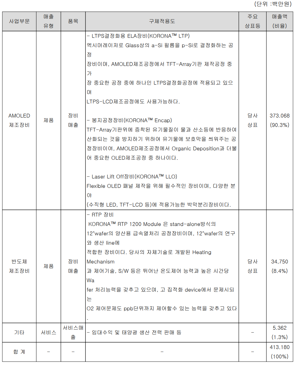 당사의 매출 구조를 보면 LTPS 결정 화용 ELA장비, 봉지(Encapsulation) 공정 장비 및 LOO(Laser Lift Off, 박막 박리) 장비 등 AMOLED 제조용 장비의 매출이 90.3%를 차지하며, RTP 등 반도체 제조용 장비가 8.4%를 차지하고 있습니다.