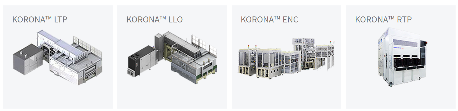 당사의 KORONA LTP 장비는 디스플레이 공정 중 저온 실리콘 결정화 공정을 위해서 순수 국산화 기술인 ELA(Excimer Laser annealing) 기술 기반으로 개발된 장비입니다. 타 경쟁 장비 대비 별도의 열처리 절차가 필요하지 않기 때문에 공정 속도가 빠르고, 비용이 절감되는 효과가 있습니다.