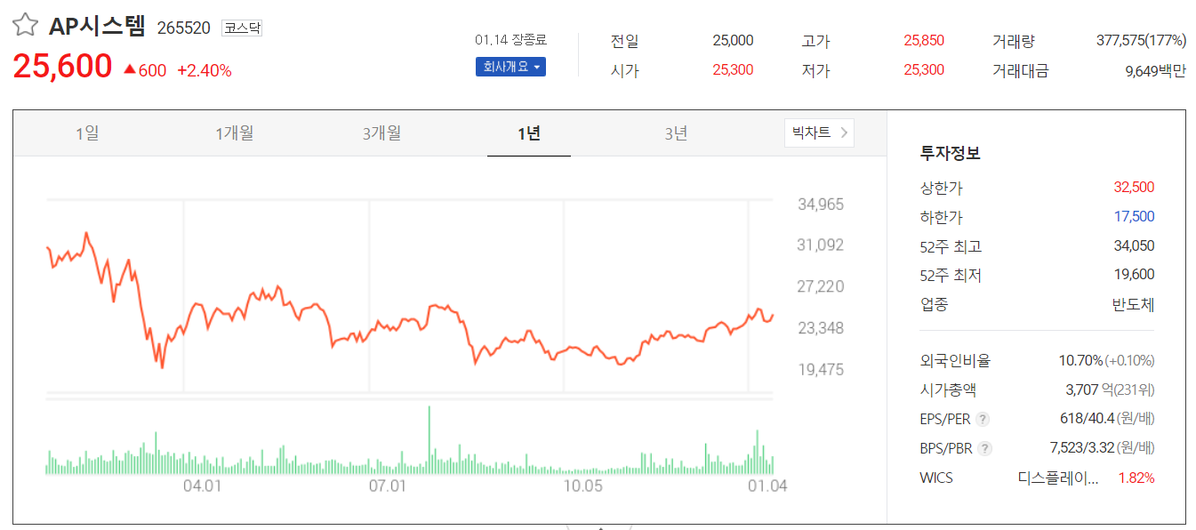 2021년 1월 14일 2.4% 상승하면서 25,600원에 마감됐습니다. 시가 총액은 3,707억 원으로 코스닥 231위 종목입니다.