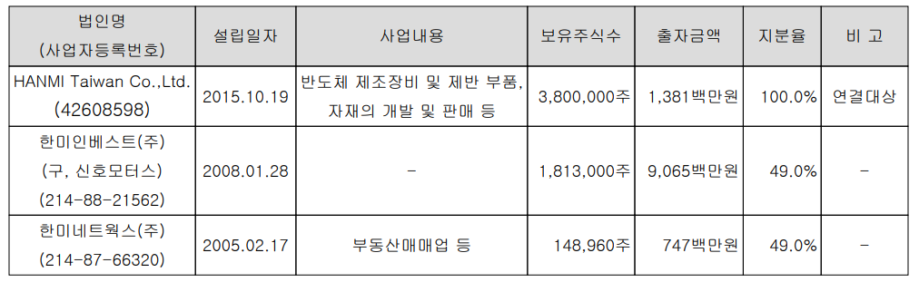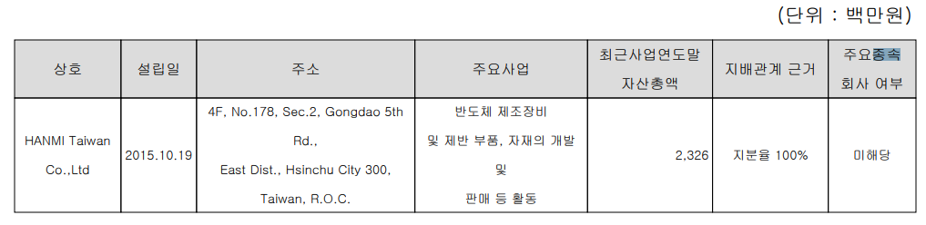 계열회사 중 타이완 법인인 한미 타이완은 반도체 제조장비 및 제반 부품의 자재 개발 및 판매를 영위하는 목적으로 설립되었고, 기업 집단의 대표회사는 한미반도체입니다.