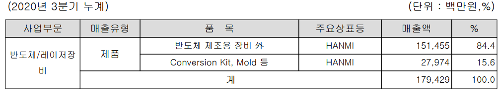 지난 2020년 3분기 누적 기준 매출액 중 반도체 제조용 장비의 매출이 전체 84.4%를 차지하고 있으며, 기타 고객의 세부 사양 및 성능 요건에 따른 관련 부품 등이 15.6%를 차지하고 있습니다.