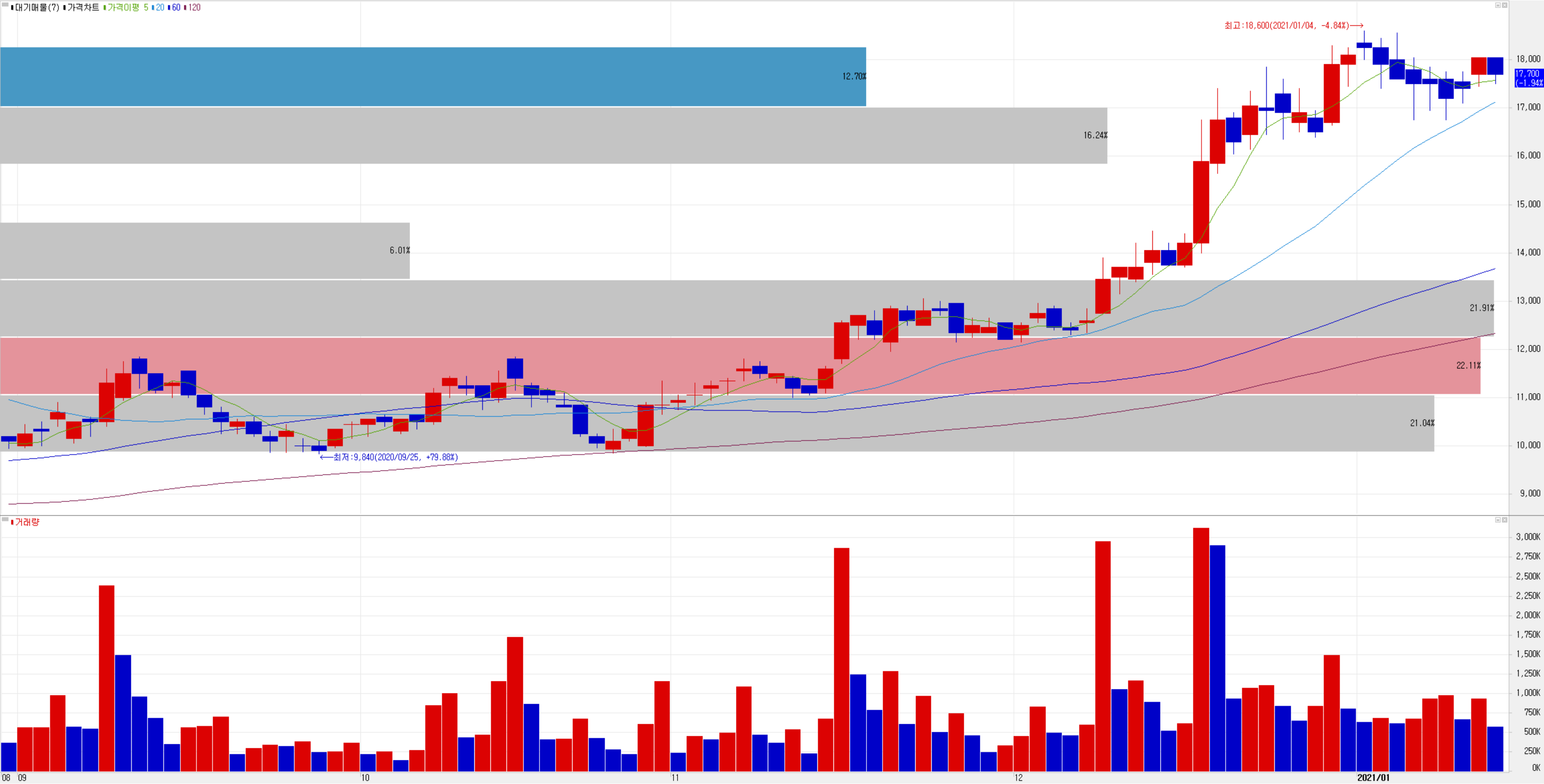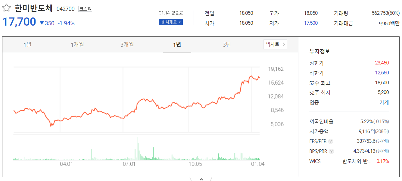 1월 14일 기준 종가는 17,700원 전고점은 18,600원으로, 시가총액은 9116억 원에 코스닥 208위 종목입니다.