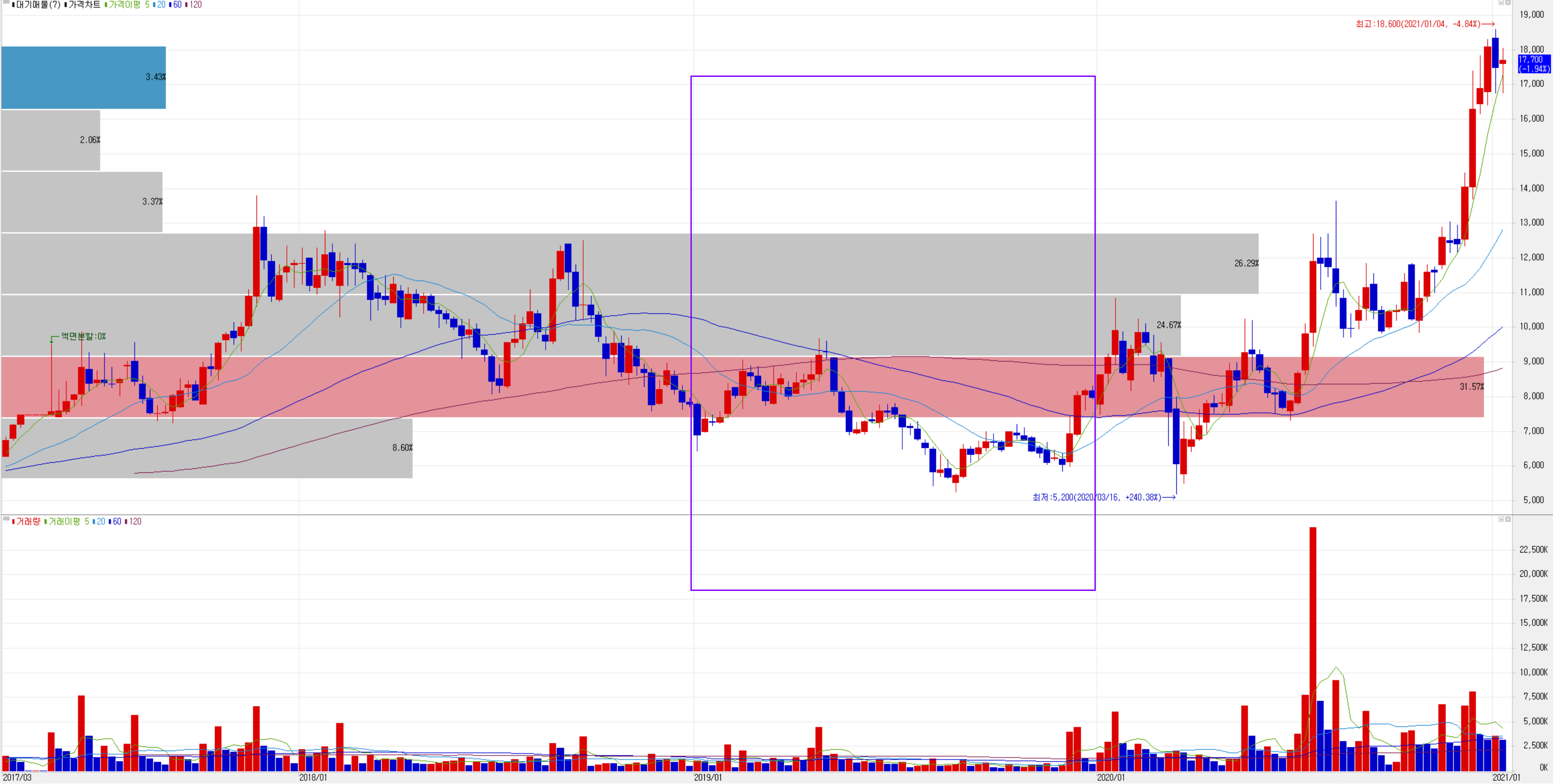 2017년부터 현재까지 한미반도체의 주봉 차트입니다. 실적이 가장 안 좋았던 2019년 주가는 연중 내내 하락세를 보이다가 2020년 코로나19 팬데믹을 거치면서 반도체 업황의 회복과 함께 상승하는 모습입니다. 또한 2020년 연간 실적이 사상 최대 실적이 예상되고, 반도체 테마 상승까지 겹치면서 주가가 급등을 했습니다. 투자 매력이 충분한 종목이지만 차트상으로는 최근 급등에 따른 조정이 와도 이상하지 않을 상황이기 때문에 단기적으로 위로는 18,500원 정도, 아래로는 1만 6700원 대에서 강한 저항이 있을 것으로 판단되고, 조정 시 매수 기회로 보고 있습니다.