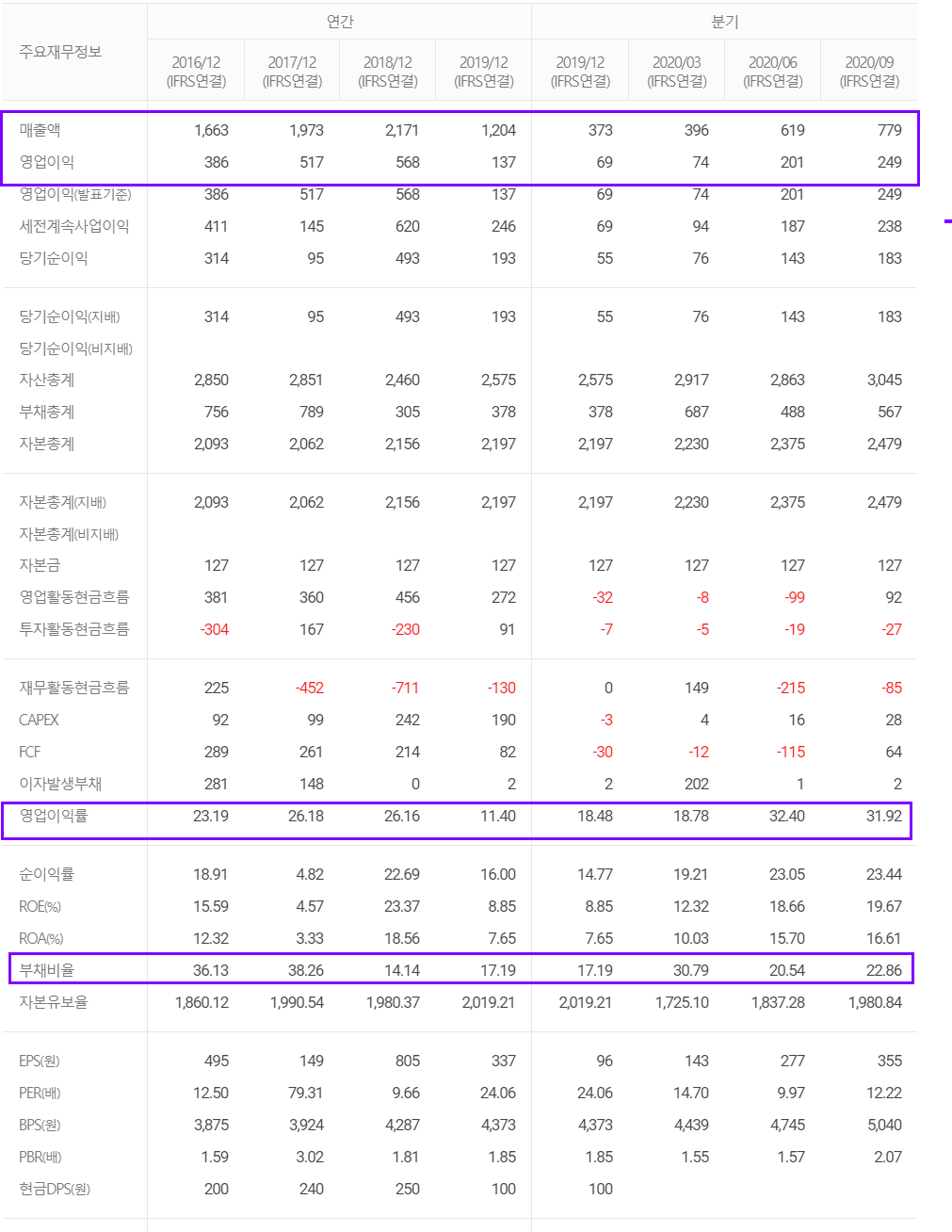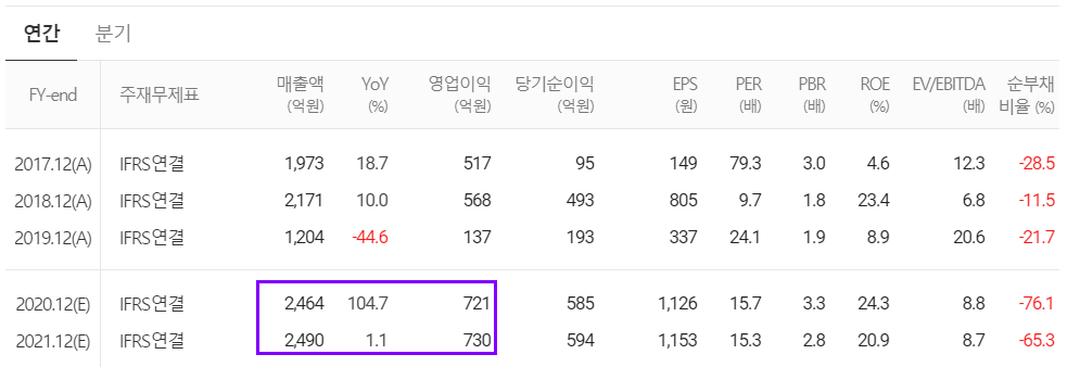 당사의 컨센서스 자료를 보면 2021년은 매출액 2490억 원으로 2020년 대비 1.1% 증가하며 영업이익은 730억 원으로 1.2% 증가하는 것으로 미미한 성장을 추정하고 있습니다. 다만 2020년 과 2021년 추정 영업이익률이 29% 대를 전망하면서 수익성이 대폭 개선될 것으로 내다보고 있습니다. 또한 2020년 창사이래 최고의 실적이 예상되는바 성장의 시작이라고 보면 큰 무리가 없어 보입니다.