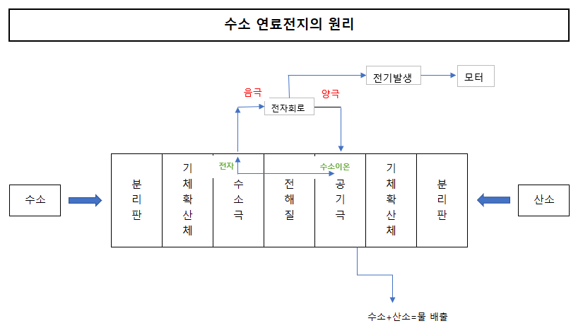 위 그림에서 처럼 수소가 주입되면 수소이온과 전자로 분리되고, 수소이온은 전해질을 통과해 산소가 있는 공기극으로 이동합니다. 전자는 전해질을 통과하지 못하고 음극에 남게 되는데 이때 두 극 사이의 전위차에 의해 전자가 음극에서 양극으로 흐르면서 전기가 발생하게 됩니다. 공기극으로 이동한 수소이온은 다시 산소와 결합 후 물이 되어 배출됩니다.
