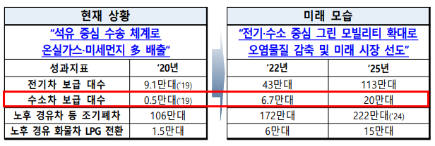 한국판 뉴딜 계획에서 그린 모빌리티 확대로 전기차, 수소차 보급 및 노후차량의 친환경차 전환 사업으로 2025년 까지 20조 3천억 원을 투자한다고 밝혔습니다.