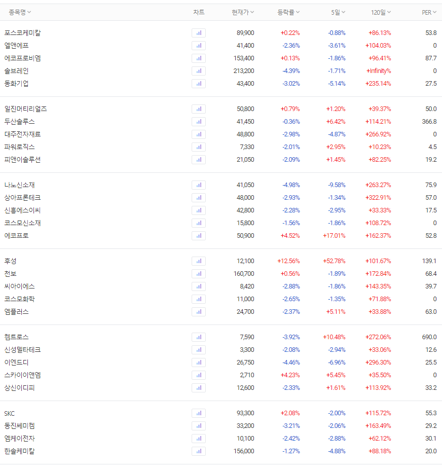 소재 관련 주에서는 일주일 간 에코프로 와 후성이 각각 17.01%, 52.78% 오르면서 상승폭을 키웠습니다.