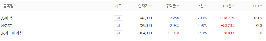 지난주 배터리 3사 전반적으로 약세를 보이는 중 삼성SDI가 -5.79% 낙폭을 기록했습니다.