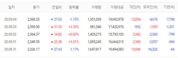 9월 4일 금요일 코스피는 미국 증시의 폭락에도 전일 대비 27.65 포인트(1.15%) 빠진 2,368.25로 마감했습니다.