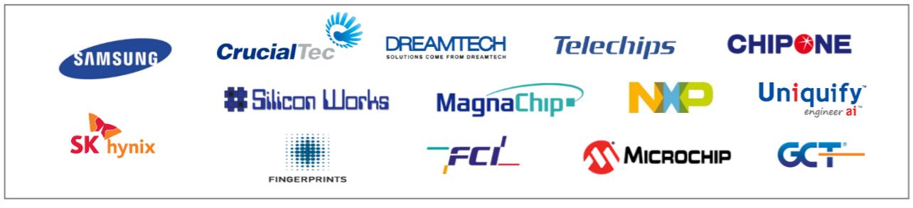 당사는 국내 삼성전자 및 SK하이닉스를 비롯하여 텔레칩스, 실리콘웍스, 매그나칩 등 10여 개의 국내외 고객사를 확보하고 있습니다.