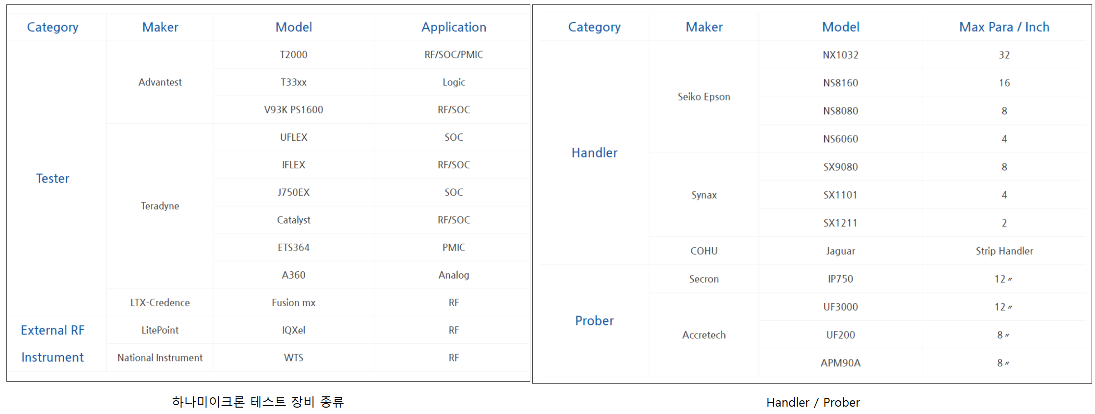글로벌 Toptier 테스트 장비 제조사인 Advantest, Teradyne 등의 장비와 다양한 Prober 및 Handler도 보유하고 있습니다.  당사는 최근 비메모리 분야의 테스트 솔루션도 본격 진출하면서 매출이 발생하기 시작하였습니다.