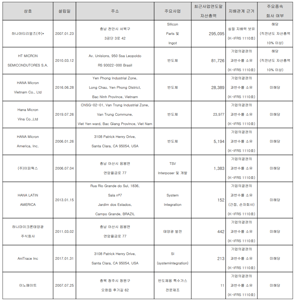 당사는 2020년 현재 총 10개의 종속회사를 보유하고 있으며, 미국, 브라질, 베트남 등지의 해외 지사 및 실리콘 잉곳 관련 사업을 하는 하나머티리얼즈, TSV 관련 개발 사업을 하는 이피웍스, 태양광발전 사업을 영위하는 하나마이크론태양광, 반도체용 특수가스를 제조하는 이노메이트 등이 있습니다.