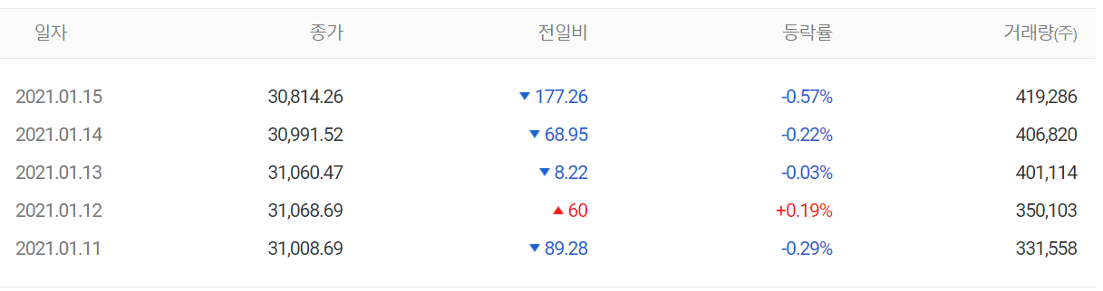 다우지수는 지난 5 거래일 동안 283.71포인트(0.91%) 내린 30814.26에 장을 마감했습니다.