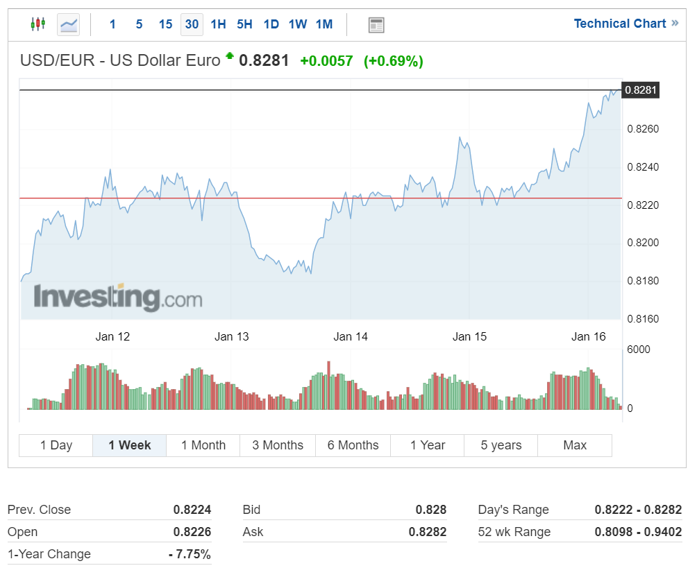 달러 대비 유로화 환율은 지난 주 한때 하락했으나 전반적으로 상승했습니다.