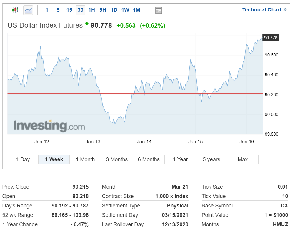 미국 달러 인덱스는 주중 한 때 대규모 경기 부양책 소식에 따라 하락했으나, 미국 국채 수익률 상승에 따른 강세를 기록했습니다.