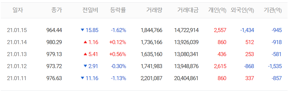 지난주 코스닥은 한 주간 23.35포인트(2.36%) 내린 964.44에 장을 마감했습니다.