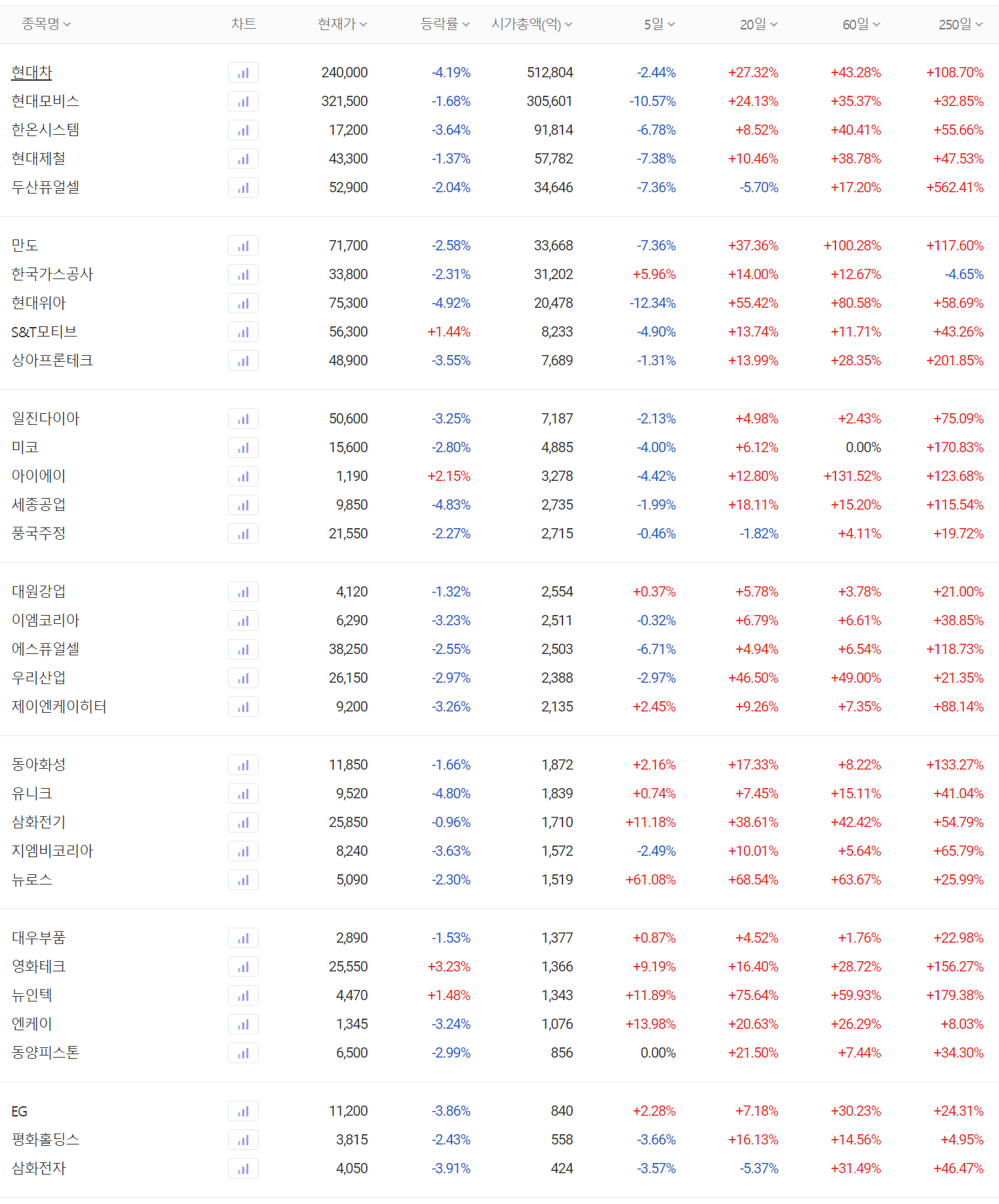 수소차(수소 연료 전지) 관련주 대장주 주간 시황