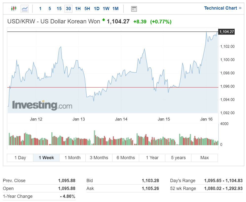 역외 원달러 환율은 지난 한 주간 글로벌 달러 시세에 따른 등락을 거듭하다가 1,100원 대를 돌파하면서 마감했습니다.