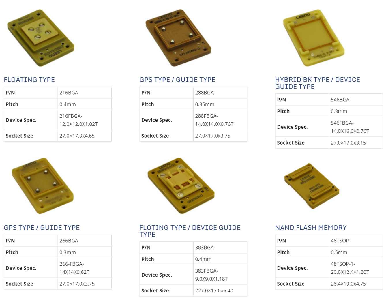 반도체 소자는 다양한 리드 타입이 있으므로, 당사는 이에 대응하는 BGA, LGA, QFN, QFP, CSP, TSOP, SOP 등 다양한 종류의 패키지에 적용할 수 있는 소켓과 PoP, 멀티 사이트 테스트 소켓 등 로직 테스트에 대한 토털 제공합니다.