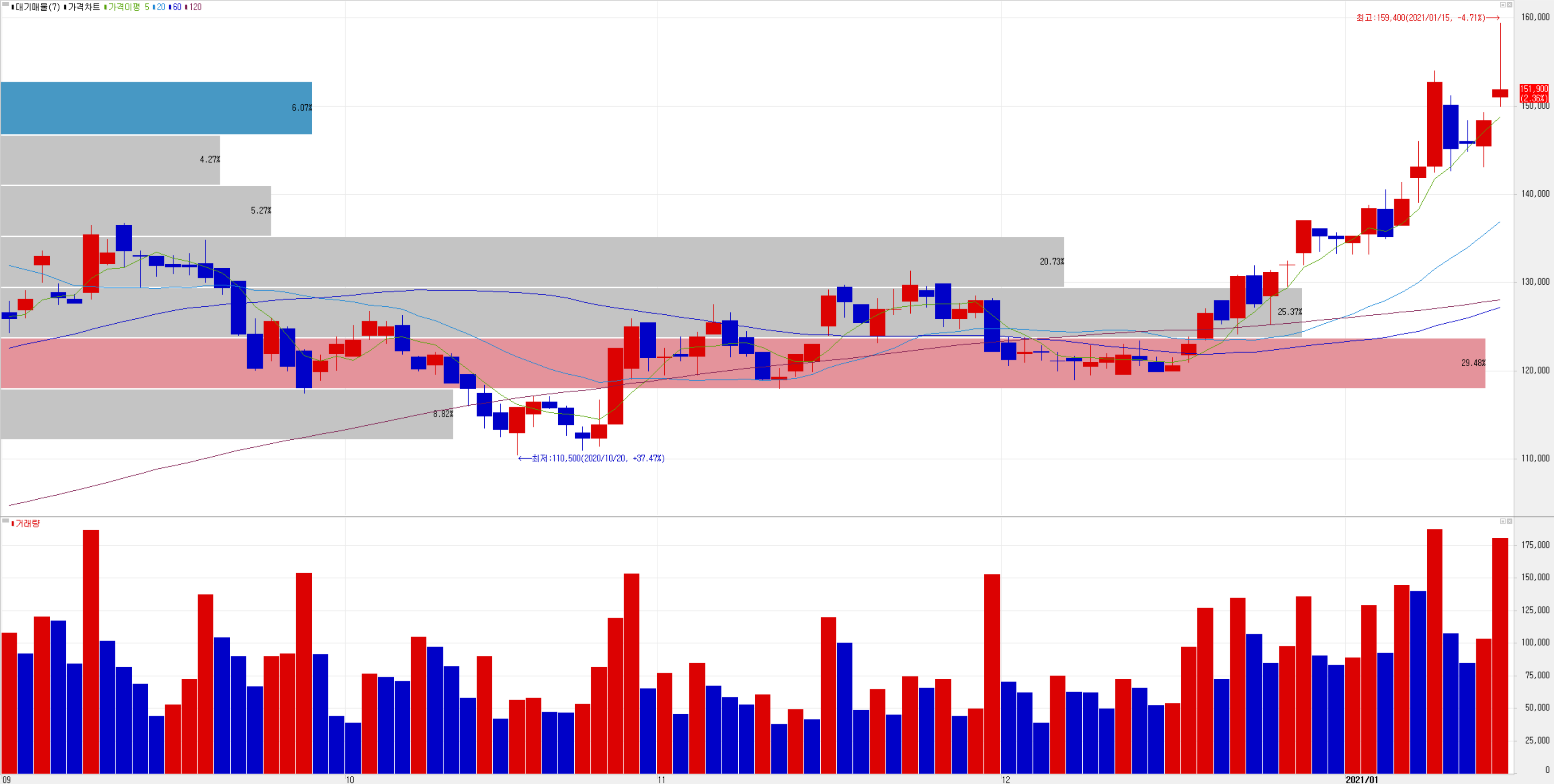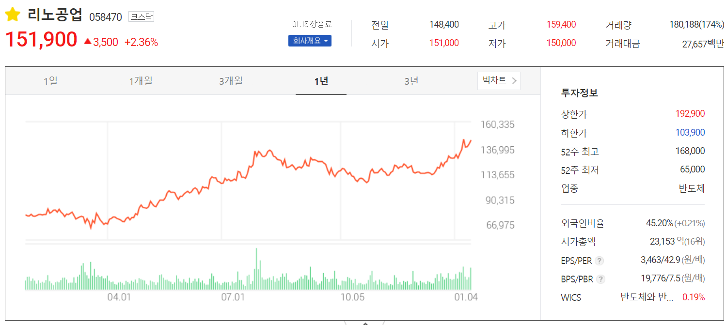 1월 15일 종가 151,900에 마감되었고, 해당일 기준 시총 2조 3153억 원으로 코스닥 16위 종목입니다. 외국인 비율이 45.20%로 높은 편입니다. 전반적으로 수급에 의한 조정 외에는 특이사항 없이 상승추세를 보이고 있습니다.