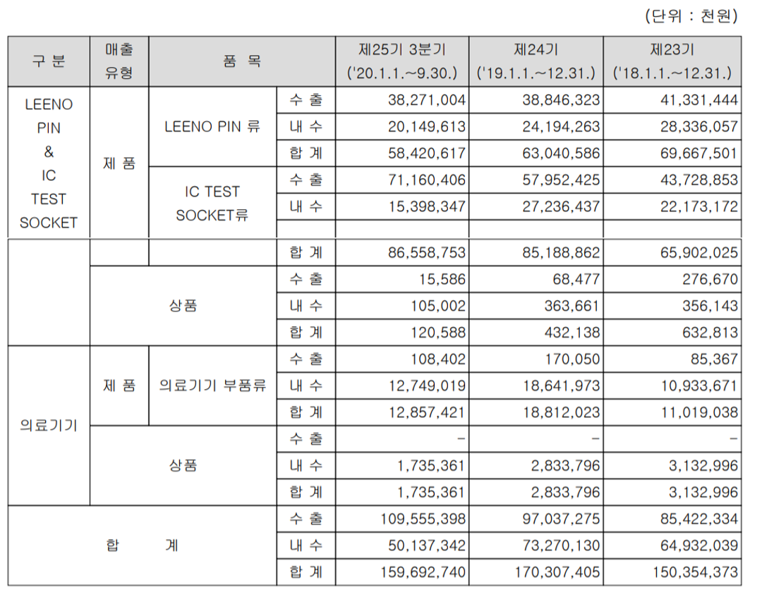 당사는 25,000여 종의 제품을 생산하고 있기 때문에 부품 별 집계에는 어려움이 있어서 크게 리노핀, IC TEST Socket 및 의료기기 부문으로 구분하여 집계합니다.