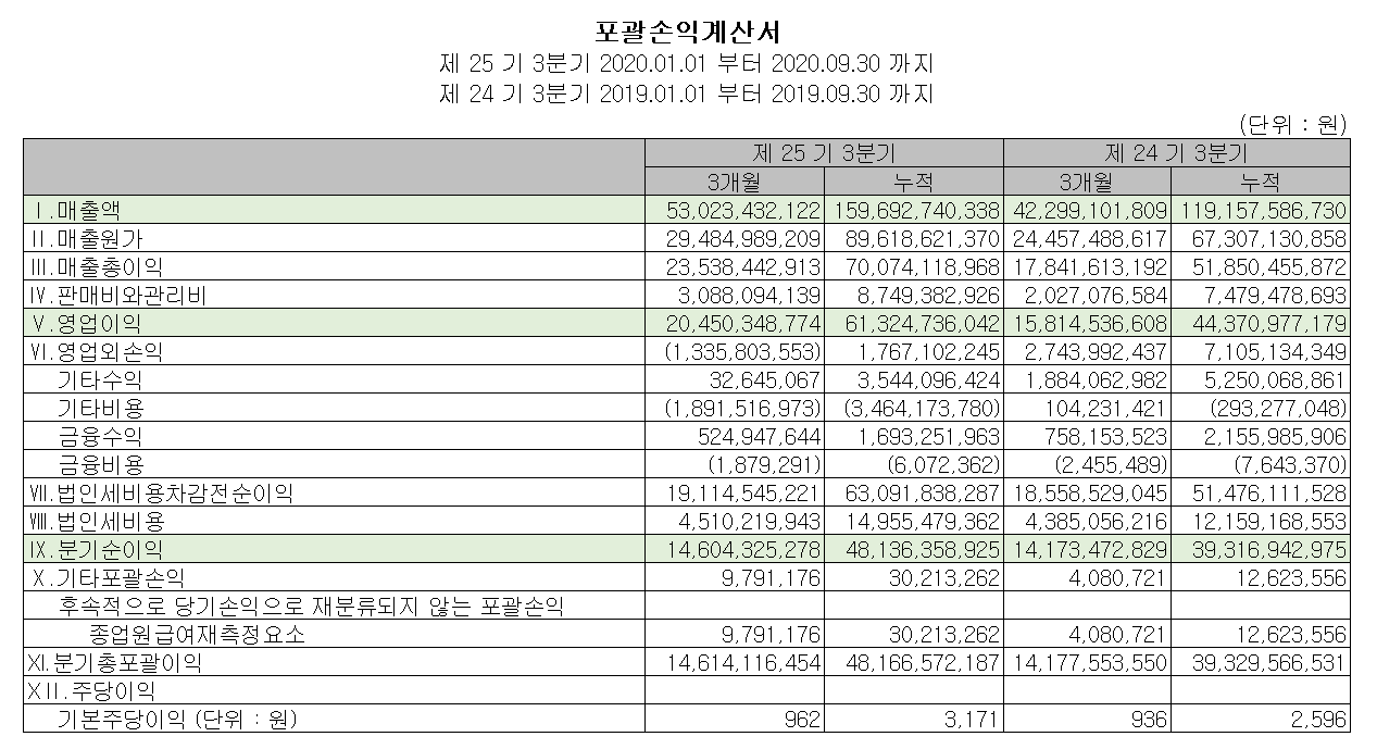 당사는 지난 2020년 3분기 매출액 1597억 원, 영업이익 613억 원으로 전년 동기 대비 각각 34%, 38.2% 증가했습니다.