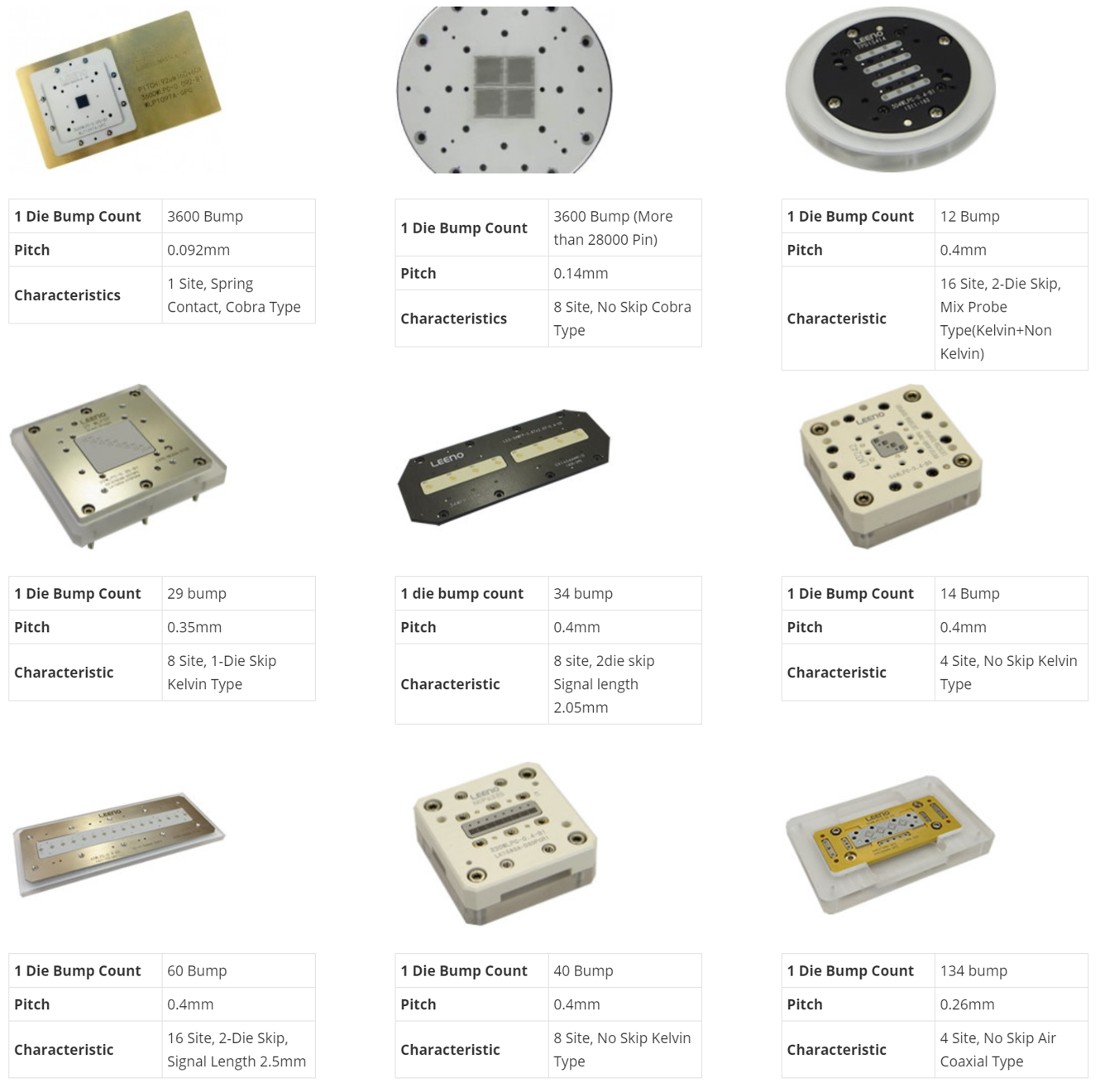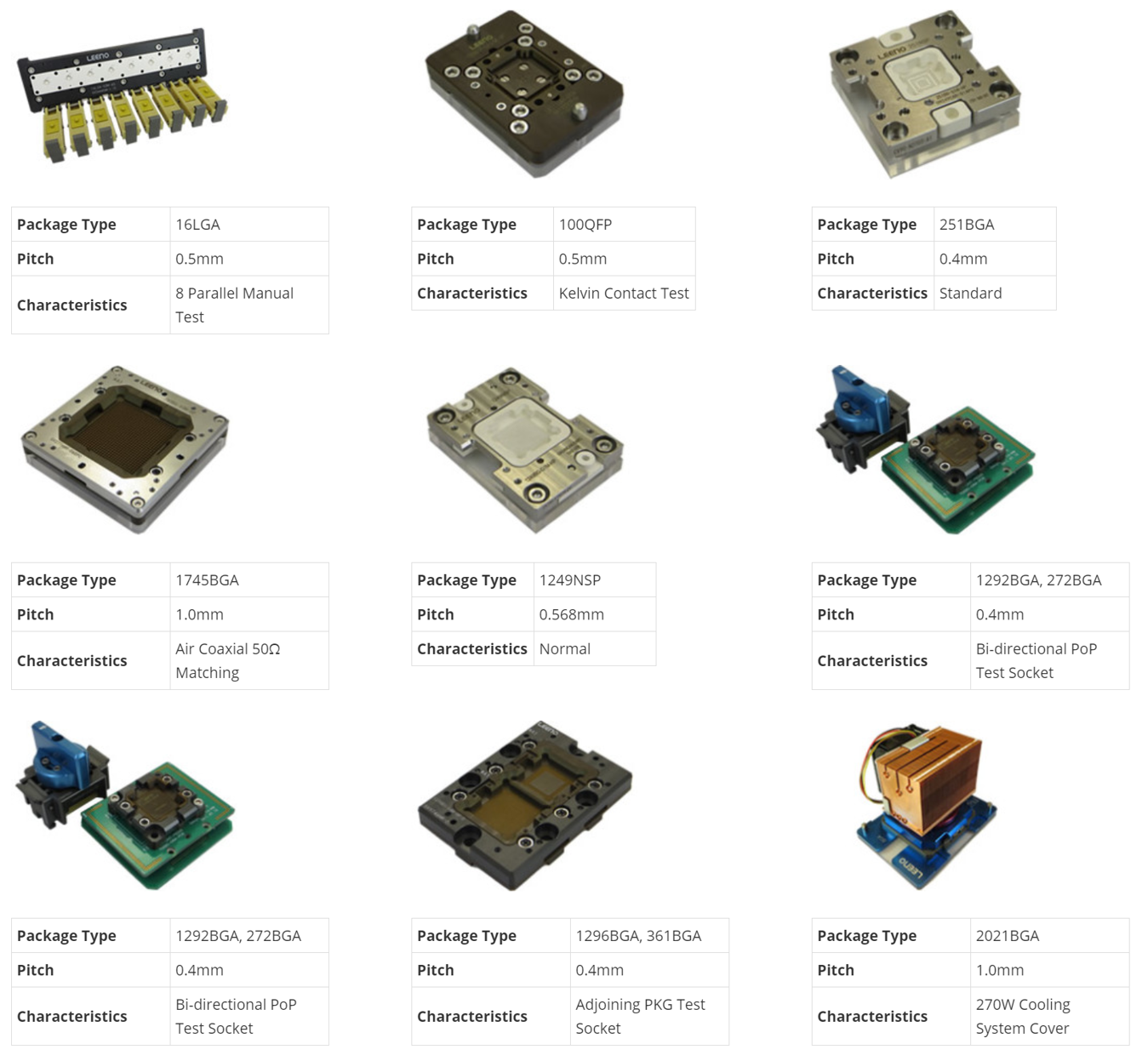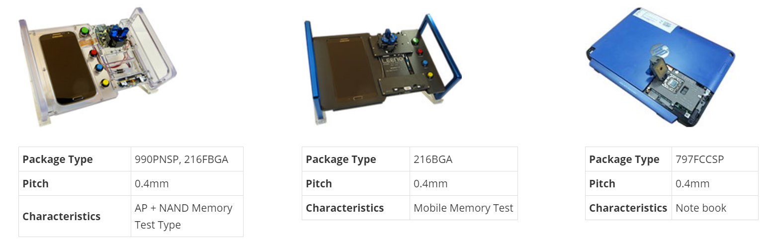 반도체 소자는 다양한 리드 타입이 있으므로, 당사는 이에 대응하는 BGA, LGA, QFN, QFP, CSP, TSOP, SOP 등 다양한 종류의 패키지에 적용할 수 있는 소켓과 PoP, 멀티 사이트 테스트 소켓 등 로직 테스트에 대한 토털 제공합니다.