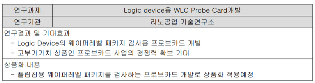 반도체가 소형화, 고집적화됨에 따라 패키징 공정에서 TSV&THrough Silicon Via)라는 기술이 주목받고 있는데, 당사는 이에 대응하는 리노핀을 개발하여 프로브카드 상품화를 위한 시제품 제작을 했습니다.