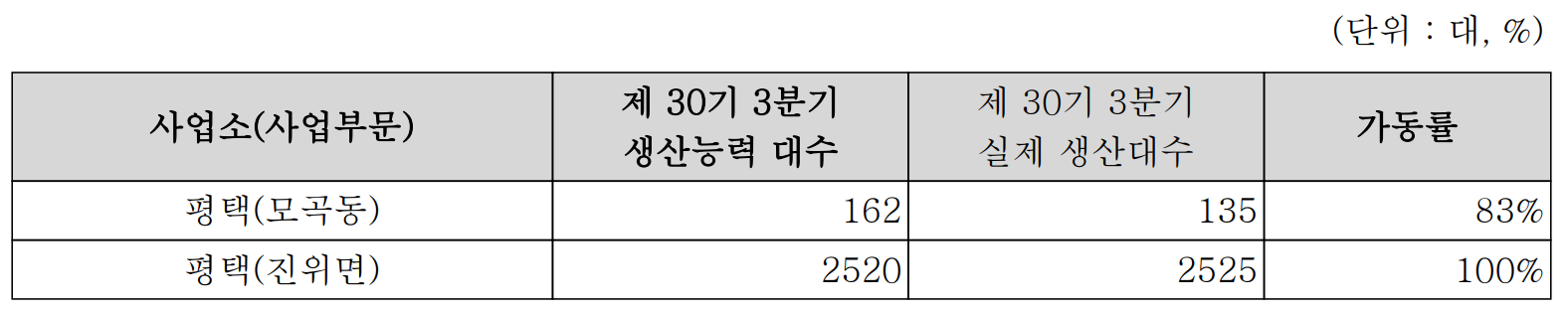 새로 이전된 진위 사업장의 가동률은 100%이고, 모곡동 설비 시설의 가동률은 83%로 준수한 수준입니다.