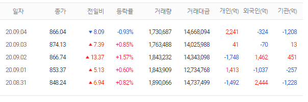 코스닥의 경우 지난주 금요일 8.09 포인트(0.93%) 내린 866.04로 마감했습니다.