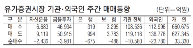 전반적으로 지난 주는 외국인과 개인의 순매수가 각각 2588억 원, 455억 원을 기록하면서 그 전 주에 비해 3% 포인트 정도 상승하는 모습을 보였습니다.