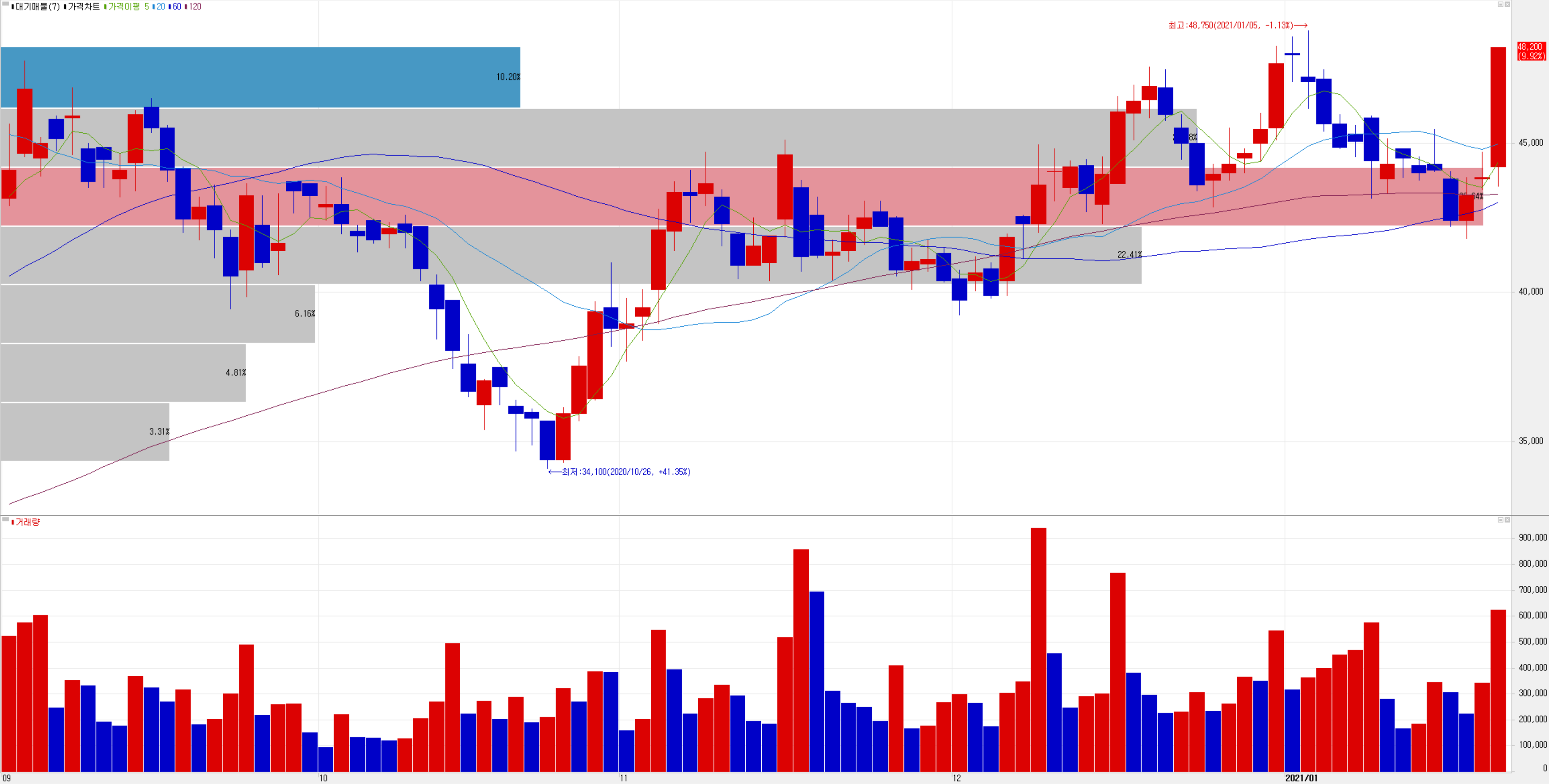 1월 21일 개인 매수세에 힘입어 장대 양봉이 나오면서 9.92% 상승 마감했습니다.