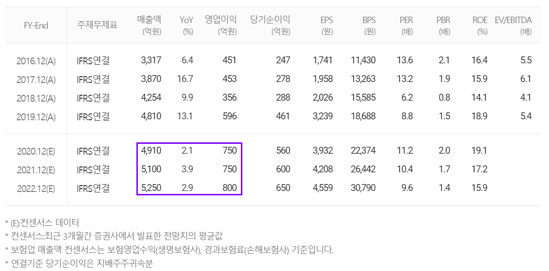 2020~2022년 3년간 매출액은 2~3%대로 큰 성장은 기대하기 어렵습니다. 컨센서스 기준 2021년 EPS가 4,208원, PER은 10.4배입니다.