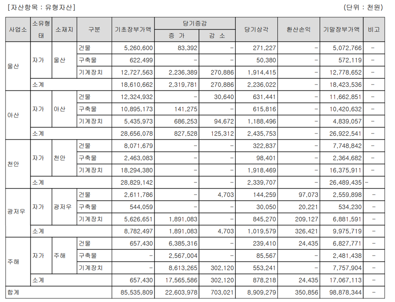 국내 및 중국의 주요 사무소(공장)에 대한 유형자산 증감 내역입니다. 2020년 3분기에는 건물, 구축물 및 기계장치에 대한 감가상각이 89억 원입니다.