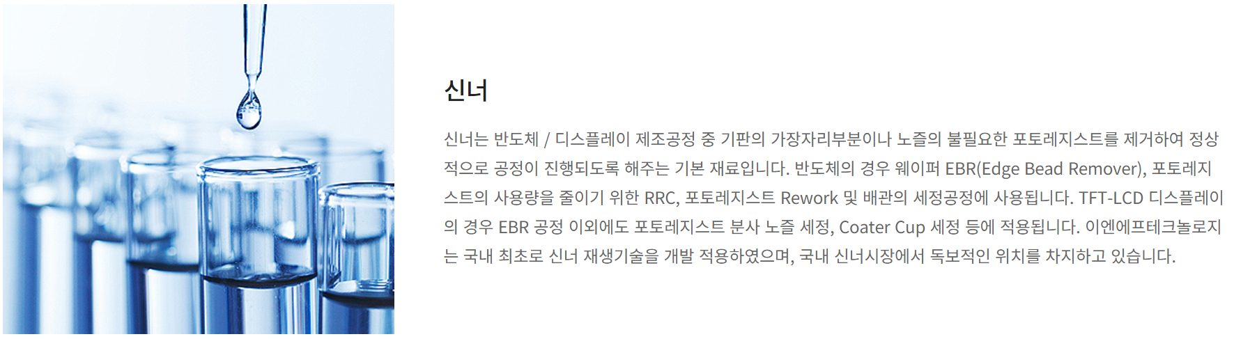 신너는 반도체 및 디스플레이 제조 공정에서 웨이퍼의 가장자리 부분이나 포토레지스트 분사 시 노즐의 불필요한 포토레지스트를 제거하여 정상적인 공정이 진행되도록 해주는 기본재료입니다. 당사는 국내 최초로 신너 재생 기술을 개발 적용하여 국내 신너 시장에서 독보적인 입지를 구축하고 있습니다.