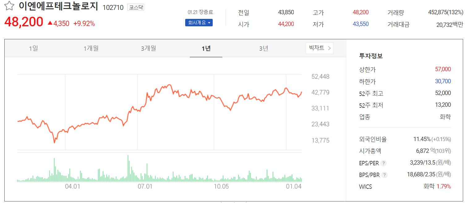 오늘 당사의 주가가 큰 폭으로 반등하면서 48,200원에 거래를 마쳤습니다. 외국인 지분율은 11.45%, 시가 총액 6,872억 원으로 코스닥 103위 종목입니다.