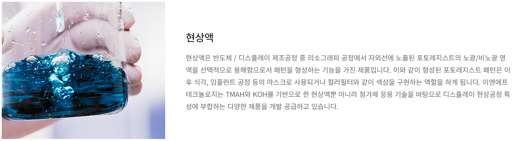 현상액은 반도체 및 디스플레이 공정 중 노광된 포토레지스트의 패턴을 형성하는 제품입니다.