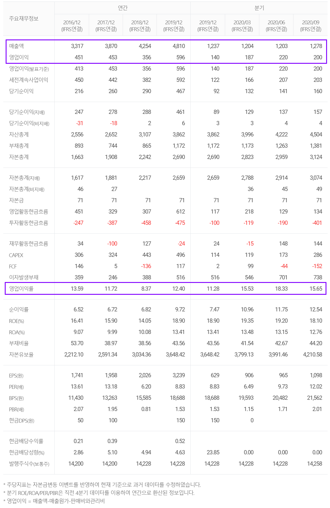 특히 2020년 3분기까지의 분기별 영업이익률이 15%를 넘게 기록한 점이 눈에 뜨입니다.