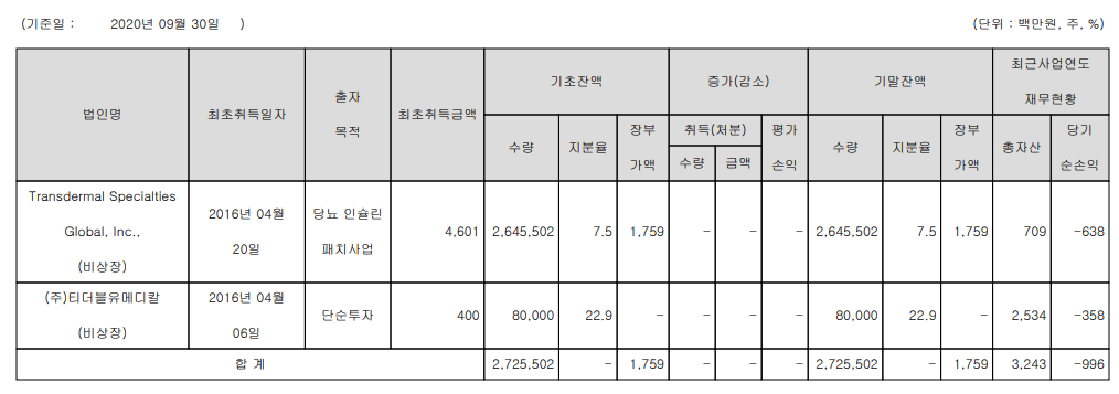 반도체 기업임에도 사업 다각화의 일환으로 미국 Transdermal Specialties Global 에 투자하였으며, 티더블유 메디칼의 지분 22.9%를 투자하였습니다.
