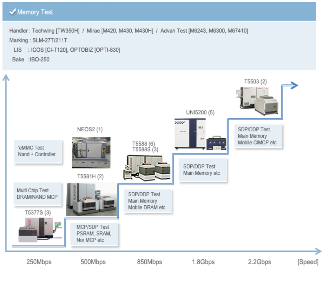 Memory 테스트의 경우 당사는 각 세대별, Speed 등 특성과 테스트 종류에 따른 핸들러, 다양한 장비를 보유하고 있습니다.