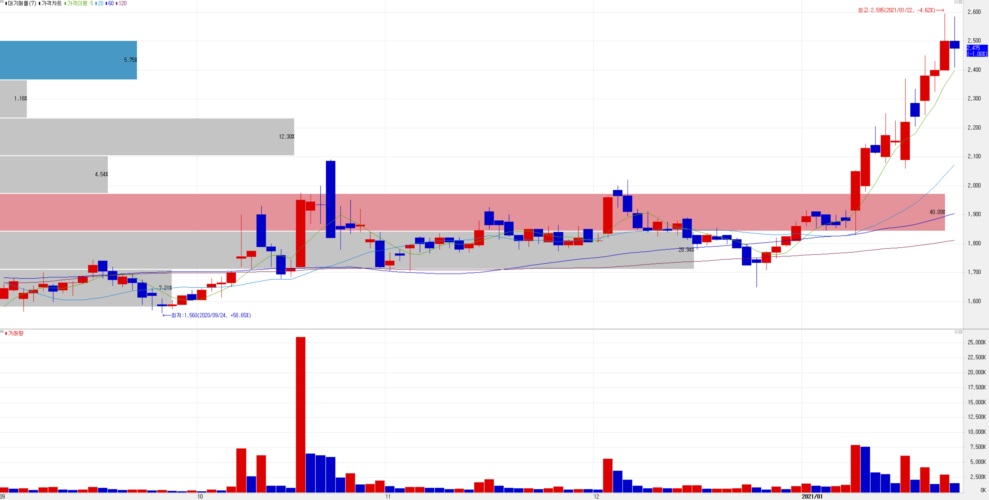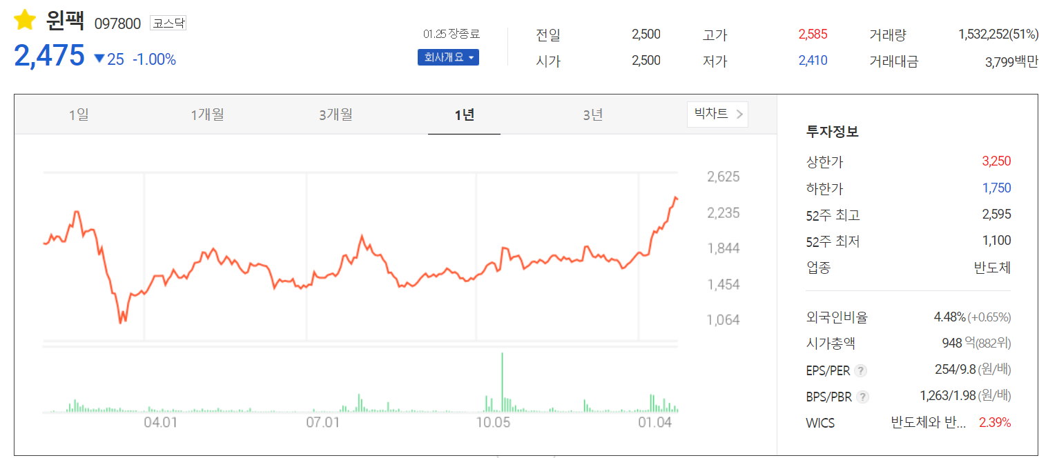 윈팩이 지난 금요일 외국인의 순매수에 신고가를 경신하고 오늘은 소폭 하락하면서 2,475원에 장을 마쳤습니다. 지난 1월 11일 외국인 비중은 4.48%이고, 시가총액 948억 원으로 코스닥 882위 종목입니다.